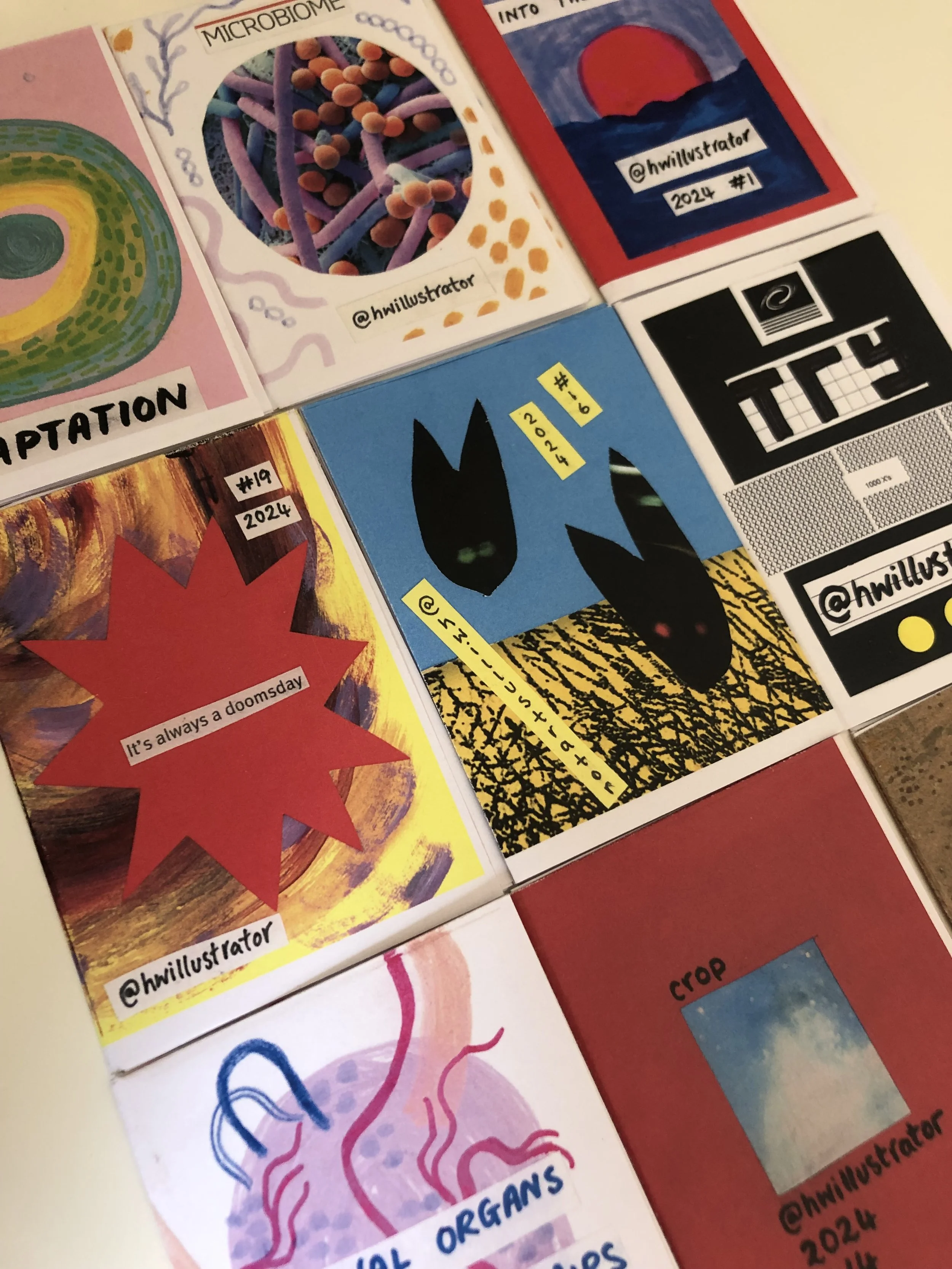This year I set myself the challenge of making an 8-page minizine every week. I am using this as an opportunity to make more work without the pressure of things being ‘finished’ or ‘polished’, and without the pressure of uploading a daily drawing the instagram, for example. It is a challenge I can complete comfortably, in my own time – the nature of zines means that even on busy weeks I am able to find pockets of time to complete something quickly, or on slower weeks I can make something more involved. The variety and freedom has been really liberating and it feels great to see 6 months worth of work all together, cut and folded into satisfying little booklets. I’m learning so much about my creative process and writing style, and it’s really interesting to see how themes evolve and recur from week to week.